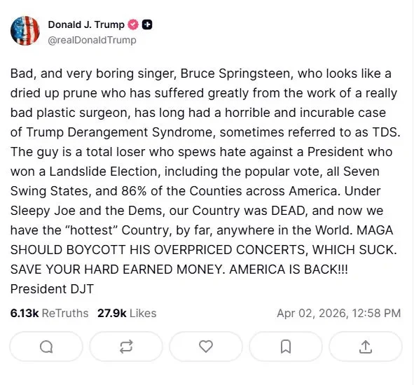 Within 24 hours, Trump fired back on his Truth Social account, dismissing Springsteen’s talent and appearance while accusing him of political bias.
