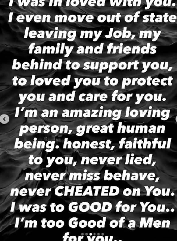 “I’m an amazing, loving person — an honest, faithful man. I never lied, never misbehaved, never cheated on you,” he added.