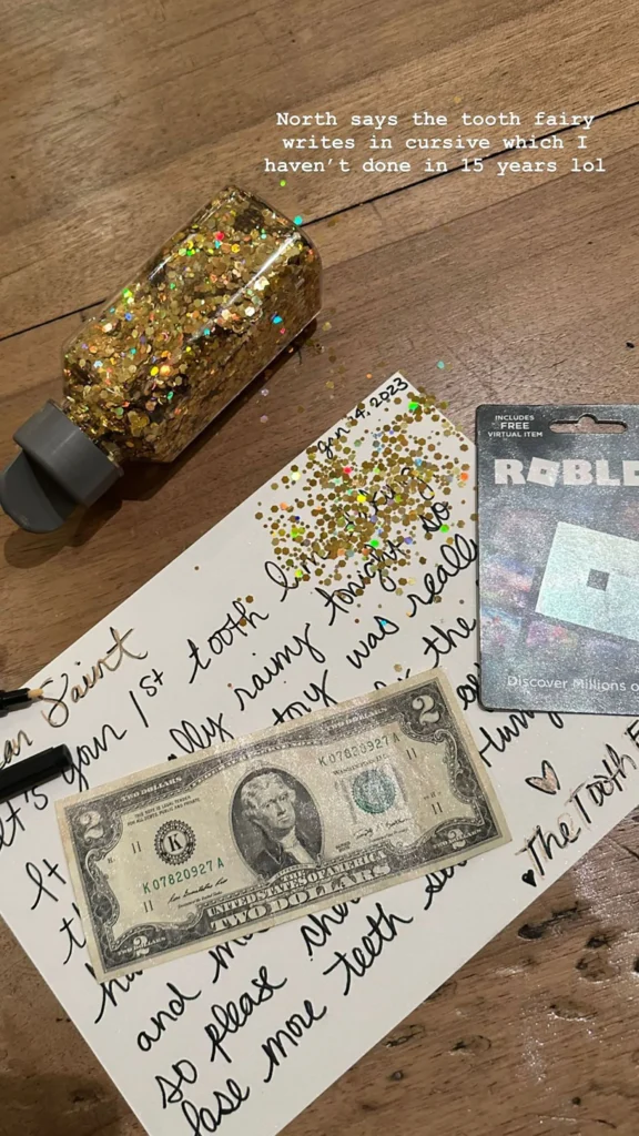 The heartwarming gesture didn’t stop at just a few pictures. Kim shared a close-up of a note addressed to Saint from the tooth fairy, which read: