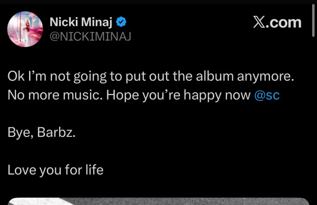 Minaj was reportedly working on her next studio album, “NM6”, which was expected to drop in 2026. However, her latest announcement suggests that the project has been shelved indefinitely. The rapper ended her post with a heartfelt message to her devoted fanbase, writing, “Bye, Barbz. Love you for life.”