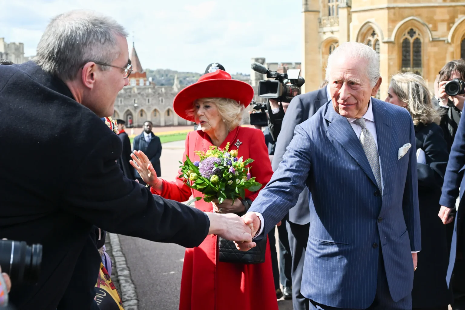 The images showcased King Charles III and Queen Camilla waving to crowds and greeting well-wishers outside the chapel.