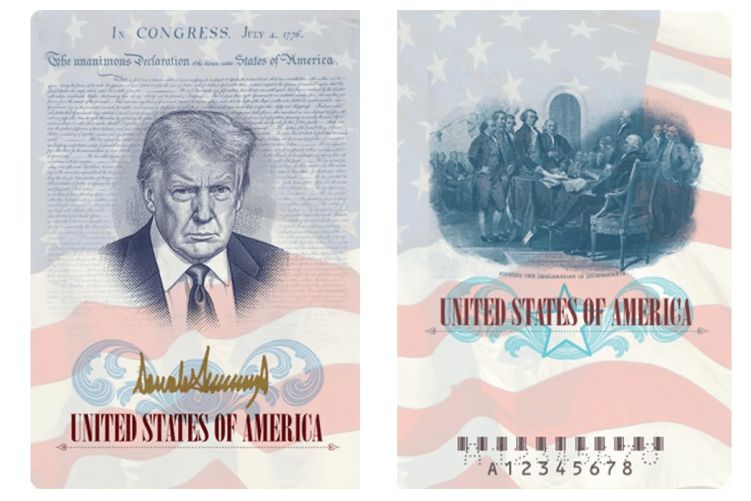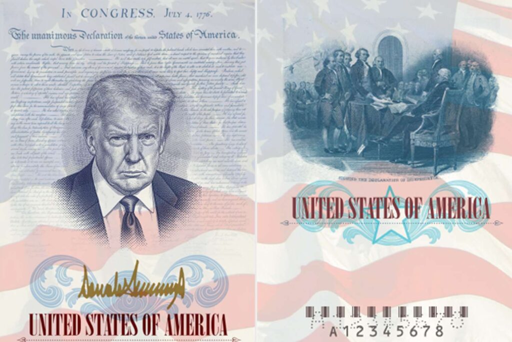 According to official renderings, the commemorative passports will include a portrait of Trump alongside imagery related to the signing of the 1776 Declaration of Independence.