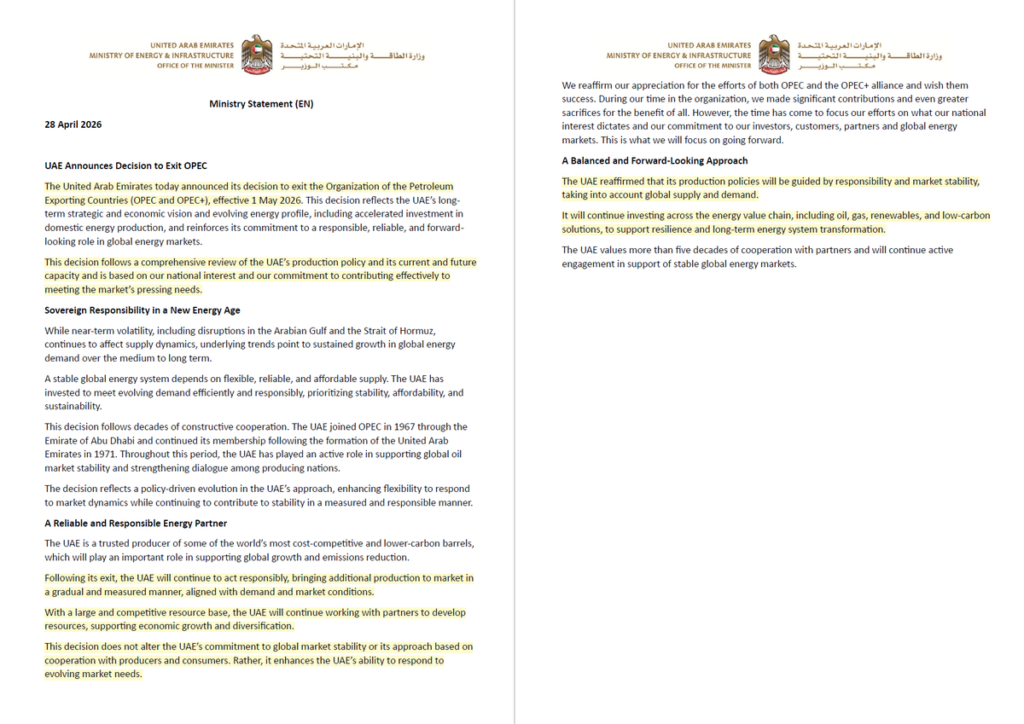 The UAE’s reported exit could reshape coordination within global energy markets, potentially impacting production decisions across major oil-producing nations.